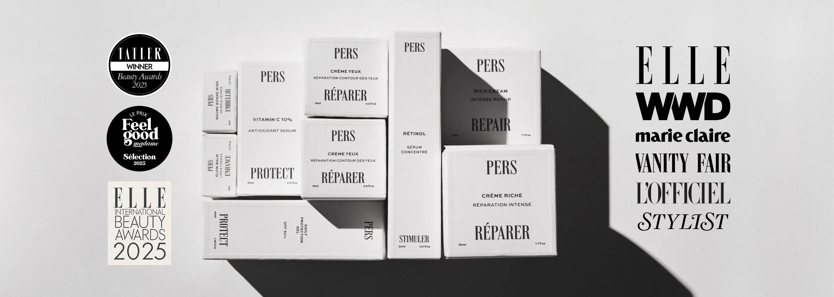 Les produits PERS sont formulés avec des actifs issus de l’univers dermo-cosmétique, sélectionnés pour leurs résultats prouvés. Toutes les formules sont Made in France, vegan, sans paraben, et contiennent jusqu’à 97% d’ingrédients d’origine naturelle.