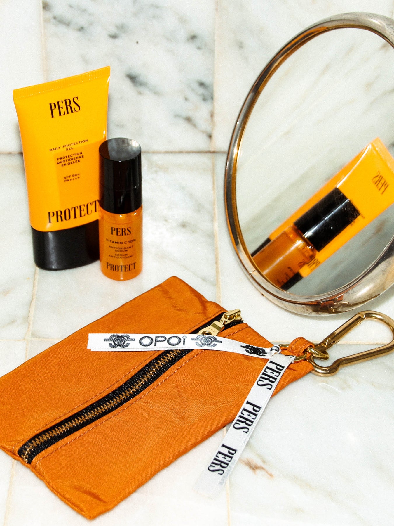 The Glow on the Go kit brings together two PERS essentials: Vitamin C Serum 10% 15ml and SPF50+ Gel Protection 40ml, in an exclusive PERS x OPOI LIMITED EDITION pouch.