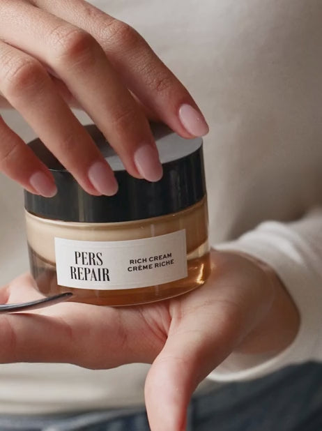 Une petite noisette de Crème Riche PERS suffit amplement pour le visage. N’oubliez pas le cou et le décolleté, une dose plus importante peut être requise pour cette zone.
