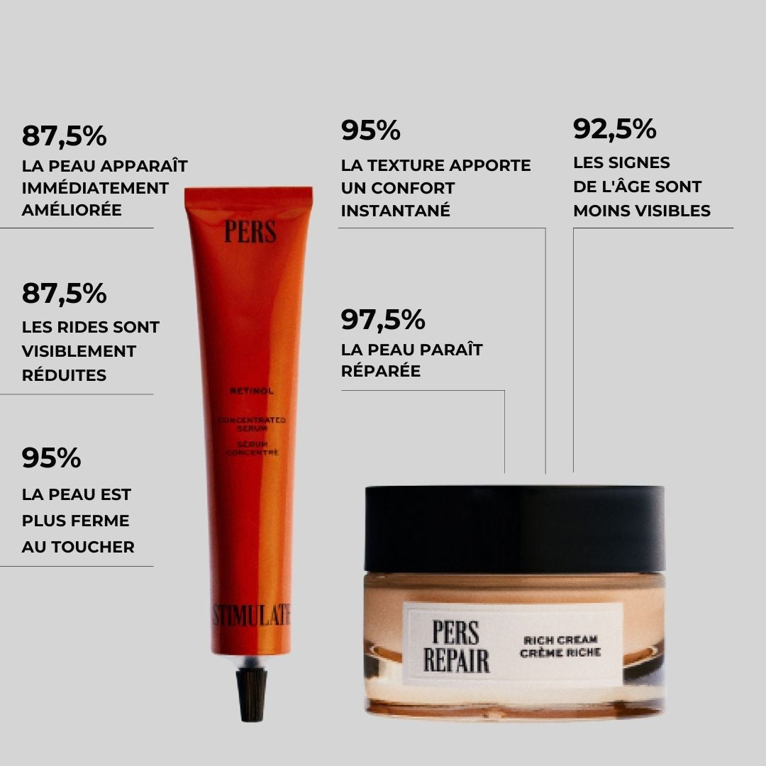 Nous conseillons d’appliquer le Sérum Concentré Rétinol 0,3% PERS un soir sur deux, en alternance avec la Crème Riche Réparation Intense PERS pour RÉPARER.