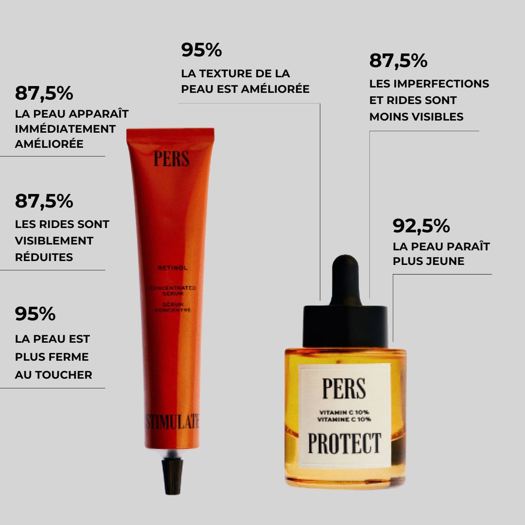 Nous conseillons d’appliquer le Sérum Concentré Rétinol 0,3% PERS un soir sur deux, en alternance avec la Crème Riche Réparation Intense PERS pour RÉPARER.