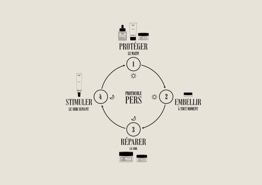 Le protocole PERS se veut universel. Quelle que soit la marque et sans se soucier du discours marketing, sa vocation est d’aider à classer l’ensemble des produits de cosmétique en quatre grandes actions : PROTÉGER, EMBELLIR, RÉPARER et STIMULER.