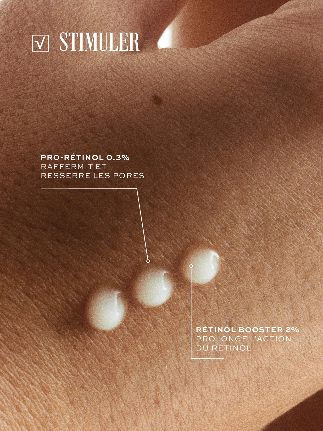 Actif de référence anti-âge, recommandé par les dermatologues, et largement répandu dans les cosmétiques, le rétinol est l’un des actifs les plus efficaces pour accélérer le renouvellement cellulaire. Le rétinol est reconnu pour sa capacité à booster la production de collagène et d'élastine pour une peau plus lisse, plus élastique et plus ferme. Il permet aussi d'éliminer les cellules mortes présentes à la surface de la peau en stimulant le renouvellement cellulaire. Les pores sont désobstrués et le grain de peau affiné, prévenant ainsi l'apparition de points noirs et/ou comédons.